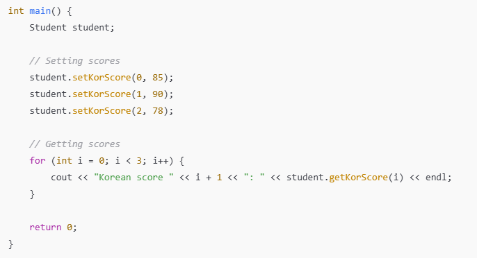 - setKorScore: 외부에서 국어 점수를 설정하는 함수입니다. 잘못된 인덱스를 방지하기 위해 조건문을 추가했습니다.