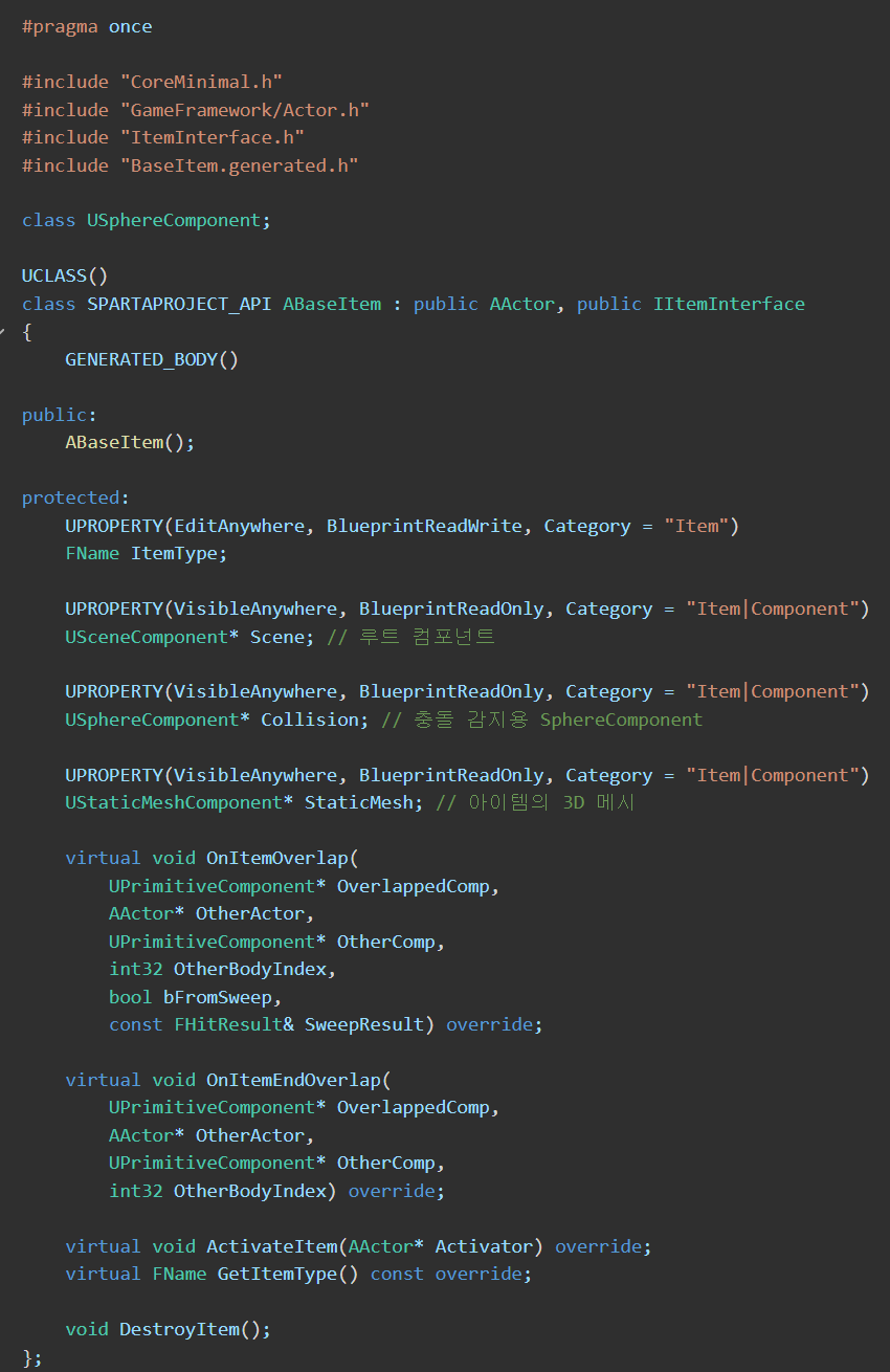 - ABaseItem 클래스에서 이미 SphereComponent가 생성되어 있음
