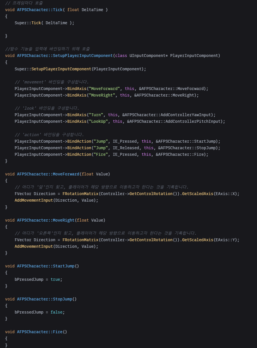 Fire 함수를 바인딩하려면 FPSCharacter.cpp: 의 SetupPlayerInputComponent 함수에 다음 코드를 추가합니다.