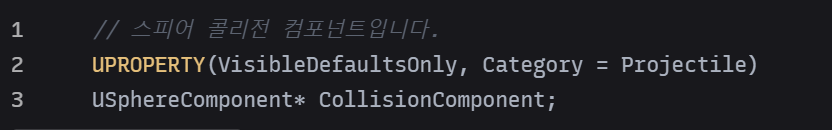 4.FPSProjectile 인터페이스의 USphereComponent 에 레퍼런스를 추가할 경우, FPSProjectile.h 의 public 액세스 지정자 아래에 다음 코드를 추가합니다.