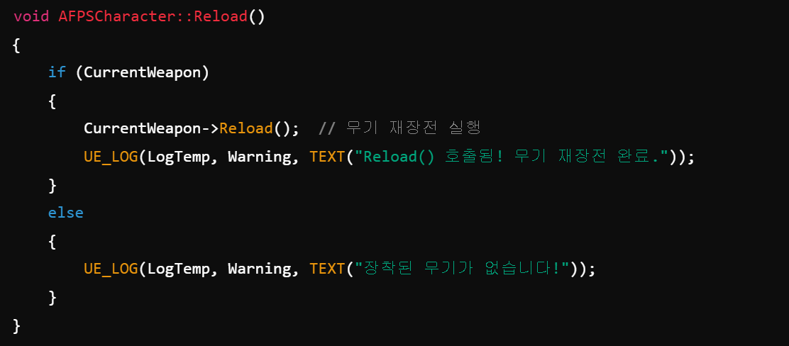 ✔ 현재 무기가 있으면 Reload() 호출하여 탄약을 채움