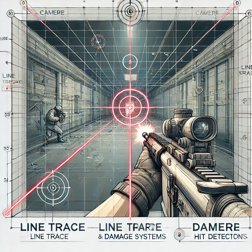 총알이 발사될 때, 화면 중앙의 크로스헤어에서 가상의 선(라인)을 발사하여 총알이 날아가는 방향을 정의합니다. 라인트레이스는 이 선이 충돌한 지점과 그 지점에 충돌한 객체를 계산하여 반환합니다. 이를 통해 빠르고 정확한 타격 판정을 할 수 있습니다.