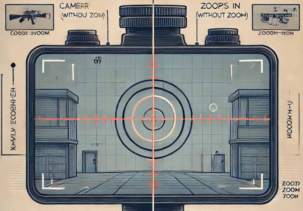 플레이어의 시점에서 카메라의 방향과 크로스헤어 위치를 설정합니다. 1인칭 FPS에서는 크로스헤어가 화면 가운데에 위치하여 이를 기준으로 총알이 발사됩니다. 카메라는 기본 시점(형상 시)과 줌 모드 시(스나이퍼와 같은 조준 모드)로 구분되어, 각기 다른 카메라 시스템을 통해 플레이어의 시점에 맞는 정확한 발사가 이루어집니다.