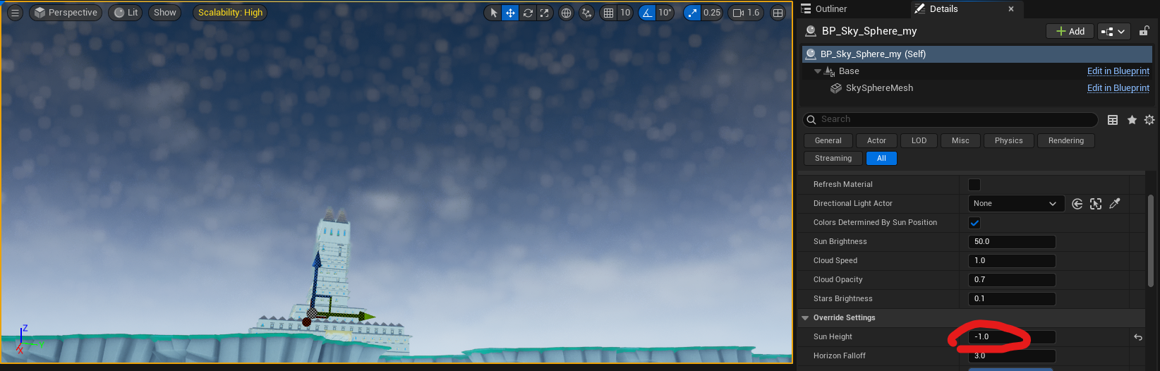 3.BP_Sky_Sphere 세팅에서 Sun Height 값을 -1로 설정 → 완전한 밤하늘 연출 가능 (별빛도 살짝 보임)
