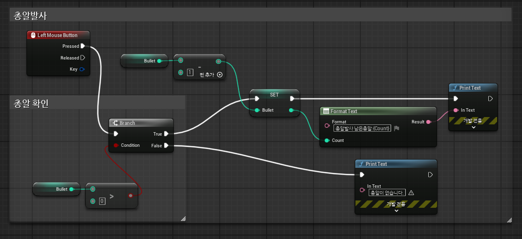 - 조건문: Branch 노드를 이용해 Bullets > 0인지 확인합니다.