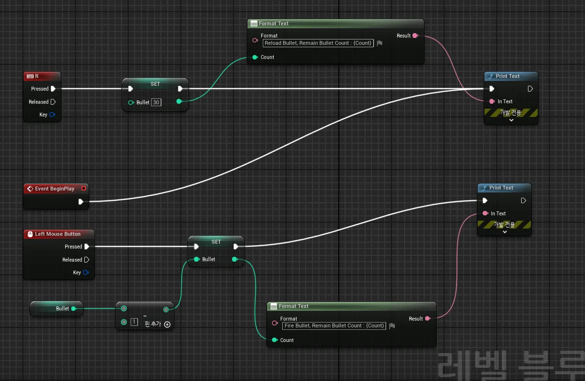- 변수: Bullets (현재 총알 수)와 Bullets (최대 총알 수) 변수를 만듭니다.